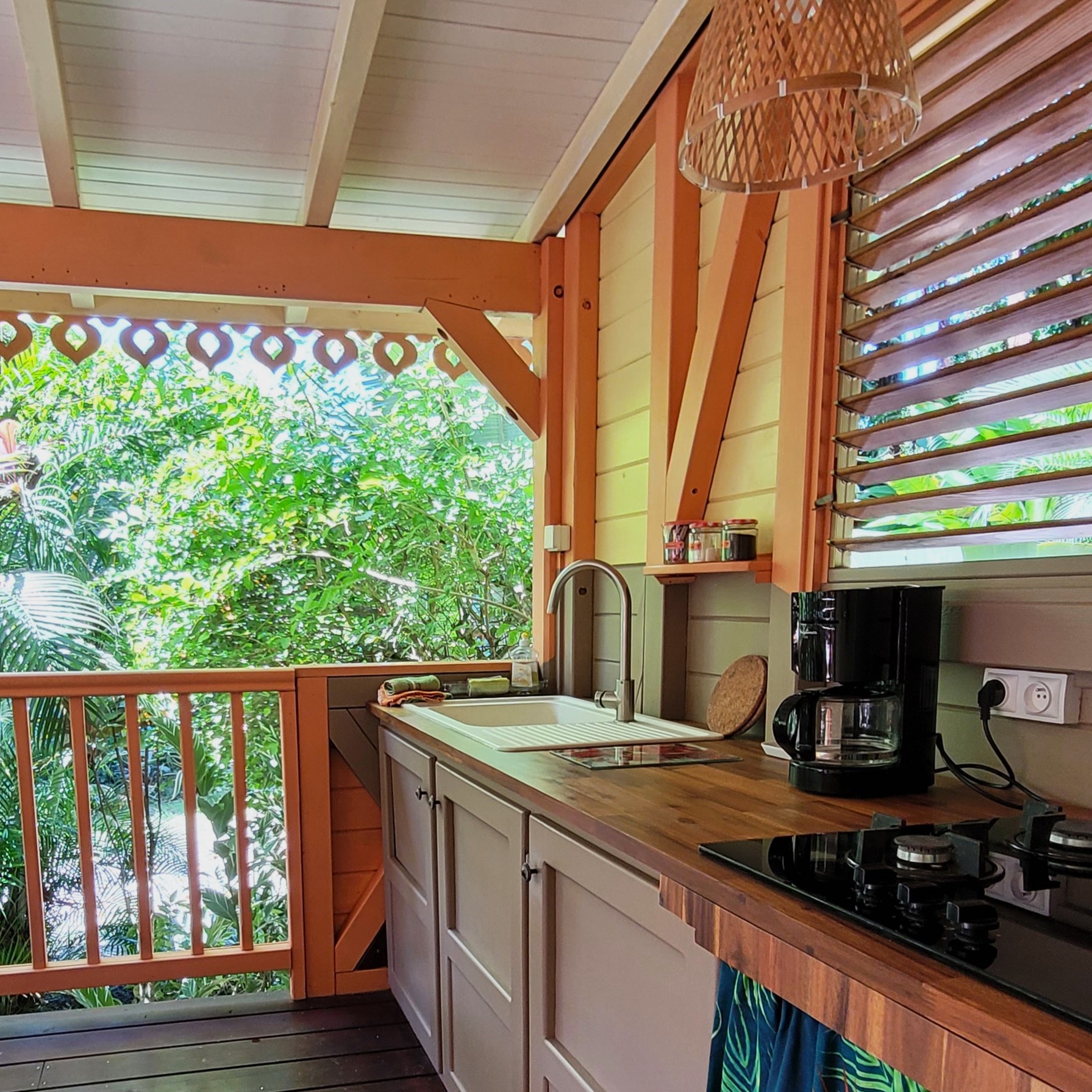 – cuisine extérieure équipée (ustensiles de cuisine, vaisselle, plaque cuisson gaz, micro-ondes, bouilloire, cafetière, grille-pain, glacière, réfrigérateur avec congélateur 3 étoiles)